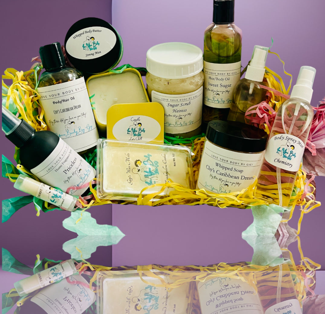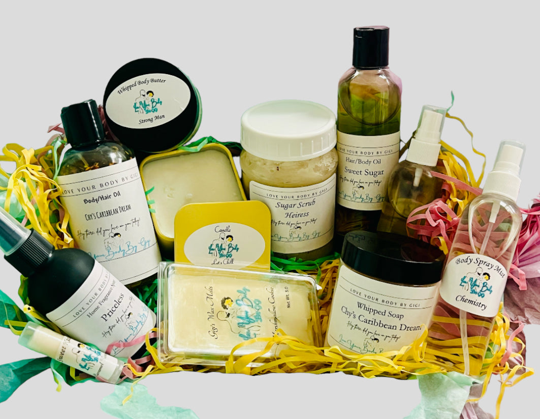 Gigi’s Spa Box is a perfect handpicked bundle that includes “1”of each of our wonderful “Body Care”items.(Options change seasonally ) Yes you read that correctly! You get a whipped soap, whipped body butter, body spray mist, dry oil spray, body oil, sugar scrub, lip balm and a candle or a wax melt . We’ve literally created a “Spa Experience” in a Box! Our Spa Box includes a plethora of fragrances to create your ultimate morning, evening, night of bliss. We chose the fragrances so that you don’t have to!💜So if you’ve planned a romantic evening, date night, girls or guys getaway, Don’t do it without our “Spa Box”! Gigi’s got you covered! Oh, don’t forget to share😘